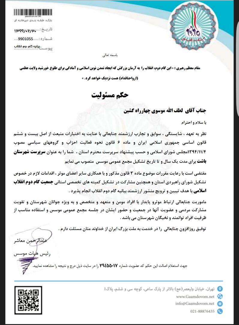 به گزارش خبرآوران طی حکمی از سوی عبدالرحمان معاشر لطفالله موسوی شهردار باشت به عنوان سرپرست حزب جمعیت دوم انقلاب اسلامی در شهرستان باشت معرفی شده است.