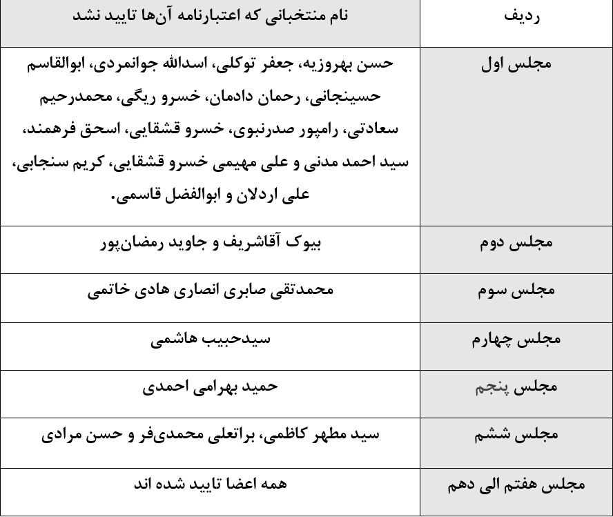 به گزارش خبرآوران از ابتدای آغاز به کار مجلس شورای اسلامی اعتبارنامه تعدادی از نمایندگان تایید نشده که در زیر آمده است: