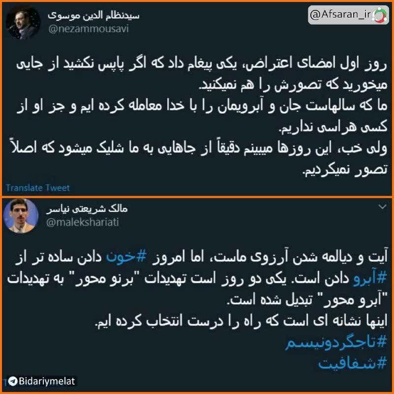 شریعتی در صفحه توییتر خود نوشت:آیت و دیالمه شدن آرزوی ماست،اما امروز خون دادن ساده تر از آبرو دادن است،یکی دو روز است تهدیدات برنو محور به تهدیدات آبرو محور تبدیل شده است اینها نشانه ای است که راه را درست انتخاب کرده ایم .