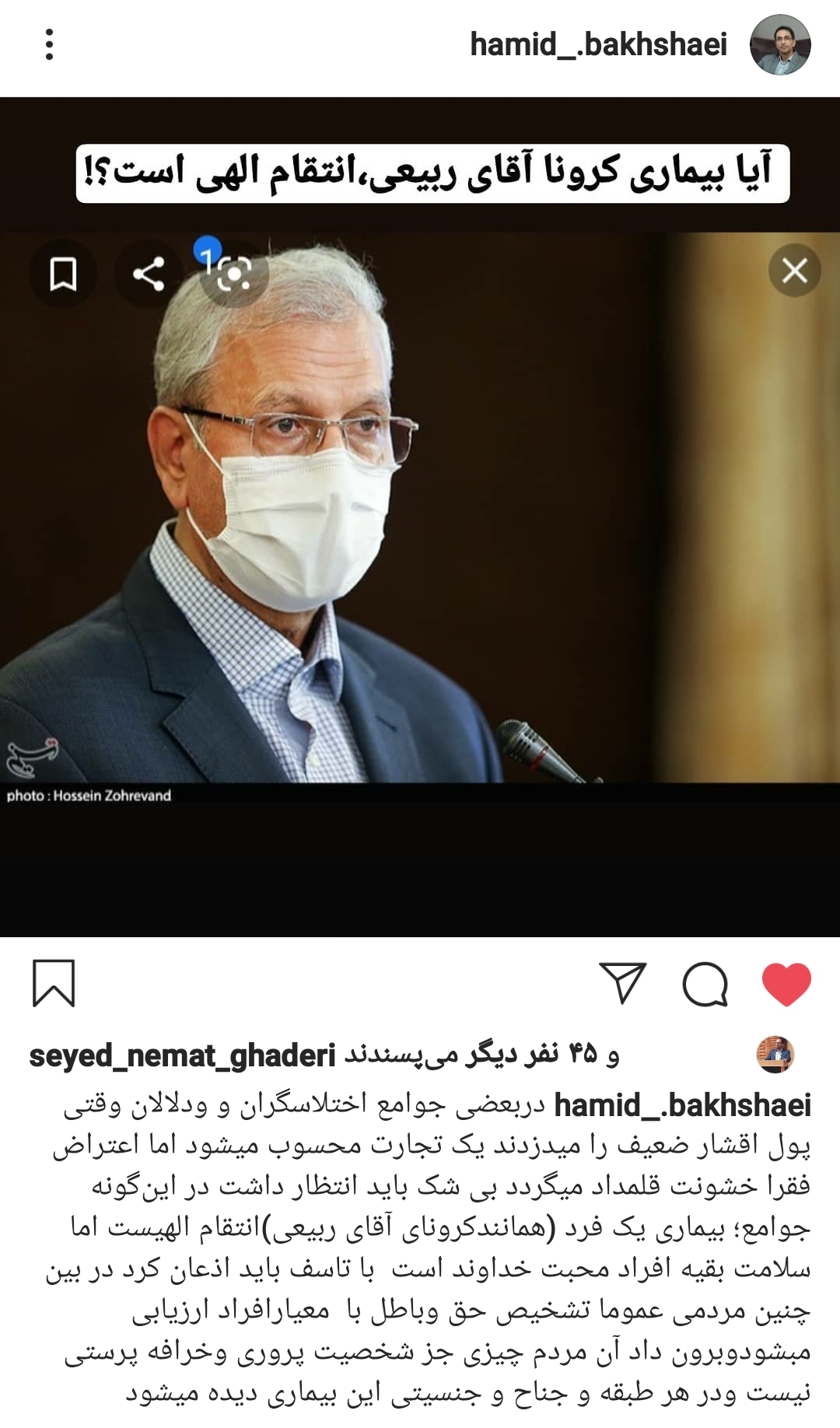 حمید بخشایی در پیچ اینستاگرامیاش با انتشار تصویری از علی ربیعی سخنگوی هیئت دولت روحانی؛ تیتر زده آیا بیماری کرونای آقای ربیعی؛ انتقام الهی است.
