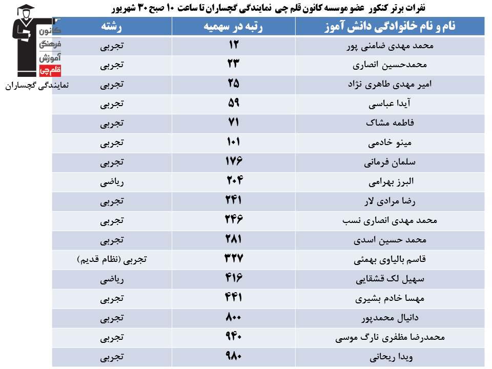به گزارش پایگاه خبری تحلیلی خبرآوران، بااعلام نتایج اولیه کنکور سراسری ۹۹، کانون آموزش قلمچی گچساران که هر ساله در این زمینه خوش درخشیده است امسال نیز لیست برترینهای کنکوری عضو این کانون را منتشر کرد. گفتنیست این لیست در حال تکمیل و بروز رسانی است.