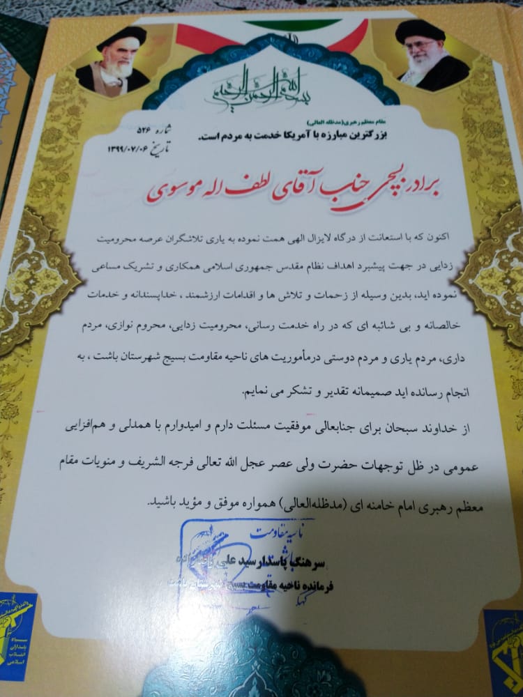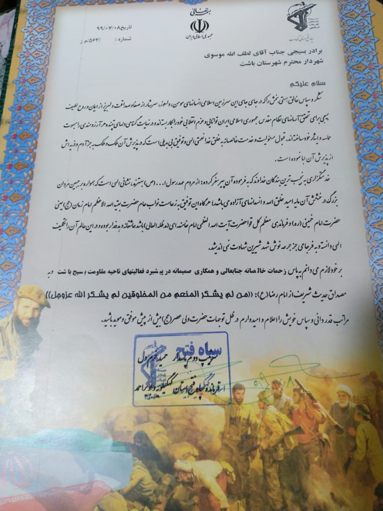 به گزارش خبرآوران عصر روز گذشته و در پایان مراسم کلنگزنی و بهرهبرداری از ۷ طرح شهرداری باشت به مناسبت هفته دفاع مقدس سرتیپ دوم پاسدار حمید خرمدل فرمانده سپاه فتح استان کهگیلویه و بویراحمد از لطفالله موسوی شهردار این شهر تقدیر و تشکر کرد، در متن این پیام تقدیر آمده است: