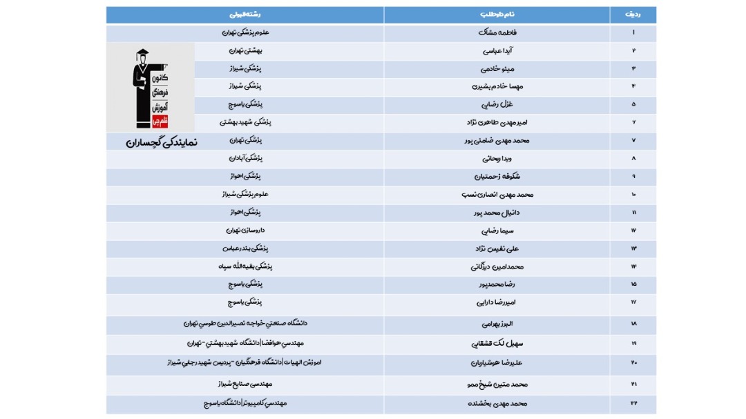 به گزارش خبرآوران کانون قلمچی گچساران اسامی پذیرفتهشدگان عضو این کانون در رشتههای پزشکی و مهندسی را منتشر کرد.