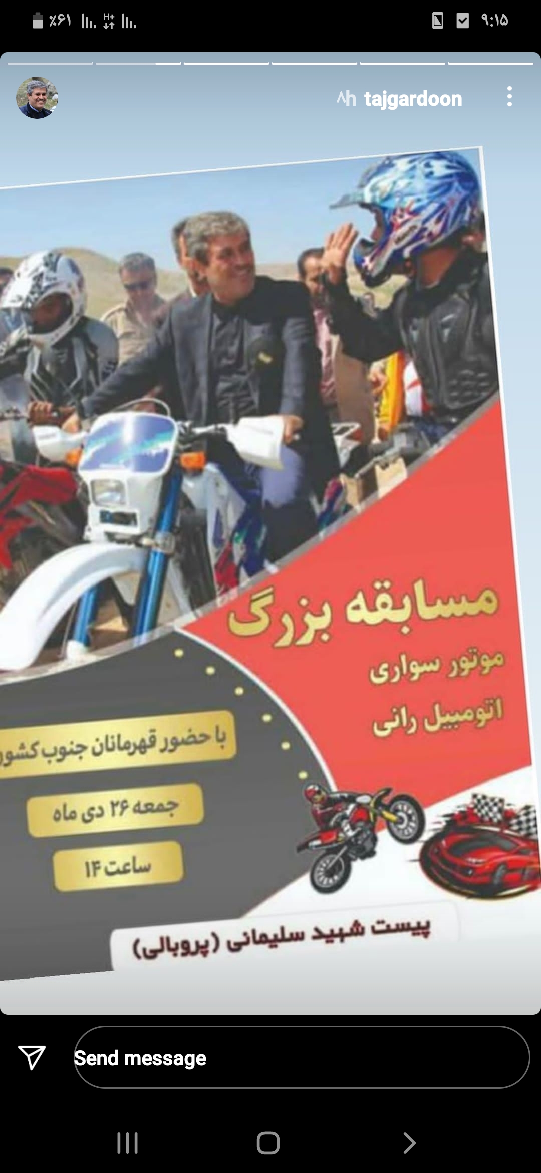 در حالی که امروز فریدون عبدالخانی رئیس اداره ورزش و جوانان گچساران به خبرآوران گفته مسابقه موتوسواری کراس که قرار بوده فردا برگزار شود، کنسل شده اما غلامرضا تاجگردون هنوز یکی از استوریهای اینستاگرامش را به تبلیغ برگزاری این مسابقه اختصاص داده.