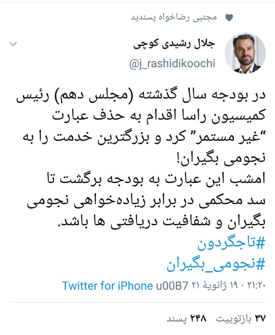 توئیتی با اشاره به عملکرد غلامرضا تاج‌گردون در کمیسیون برنامه و بودجه مجلس نوشت: