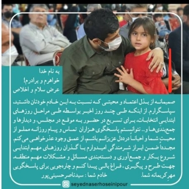 عرض سلام و اخلاص صمیمانه از بذل اعتماد و محبتی که نسبت به این خادم خودتان داشتید،سپاسگزارم.از اینکه طی چند روز اخیر بواسطه طی مراحل روزهای ابتدایی انتخابات،برای تسریع در حضور به موقع در مجلس و دیدارها و جمع بندی ها و….نتوانستم پاسخگوی هزاران تماس و پیام روزانه مملو از محبت شما و احیانأ درد دل عزیزانم باشم،از عمق وجود عذرخواهی می کنم.مجددا ضمن ابراز شرمندگی امیدوارم با گذران روزهای مهم ابتدایی شروع بکار و جمع آوری و دسته بندی مسائل و مشکلات مهم منطقه،جهت طرح و پیگیری،فراغ بالی پیدا کنم و چاره جویی برای پاسخگویی مهر کریمانه شما.
