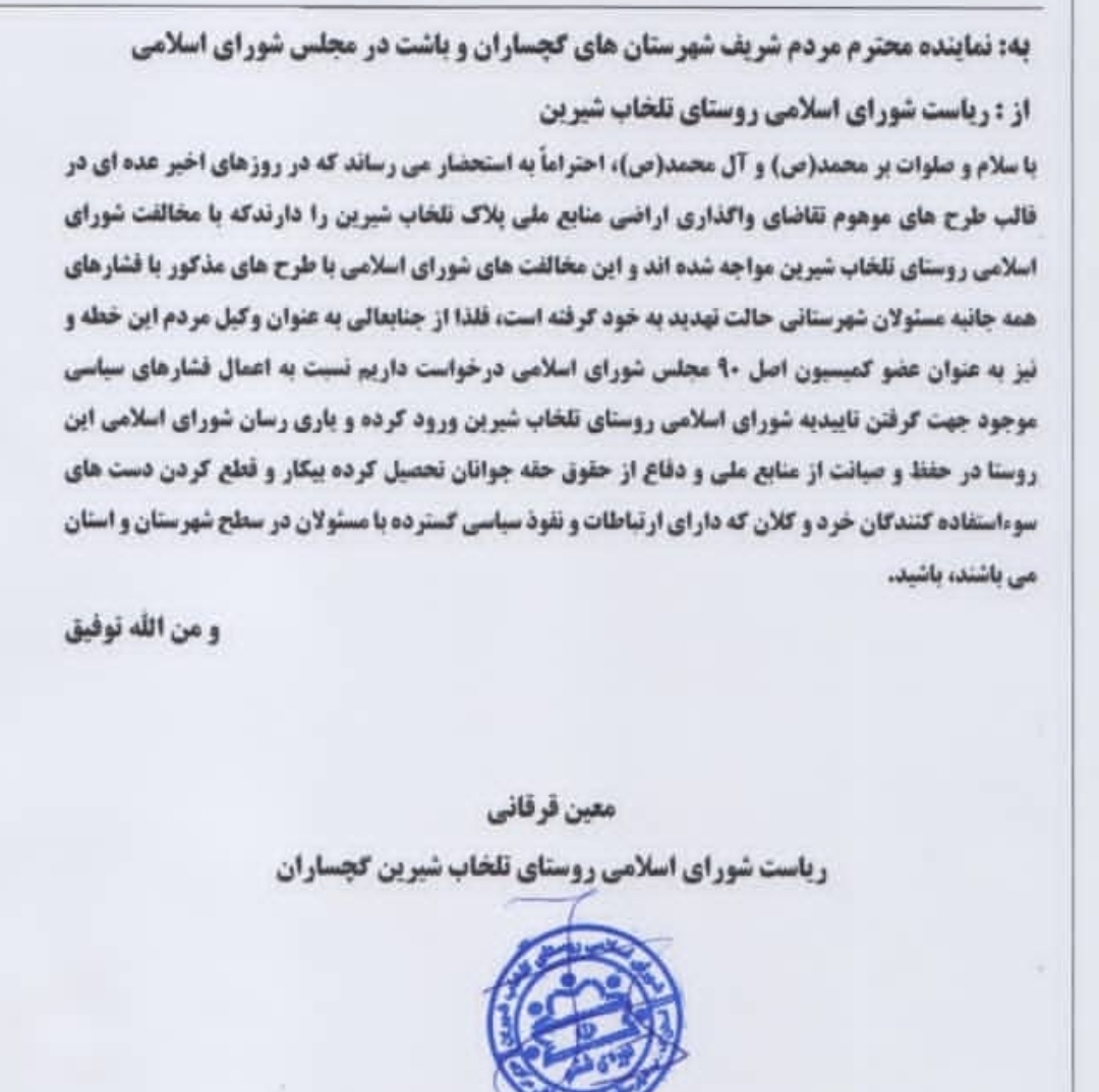 به نماینده محترم مردم شریف شهرستان های گچساران و باشت در مجلس شورای اسلامی از ریاست شورای روستای تلخاب شیرین با سلام و صلوات بر محمد و آل محمد احتراماً به استحضار می رساند که عدهای در قالب طرحهای موهوم تقاضای واگذاری منابع طبیعی