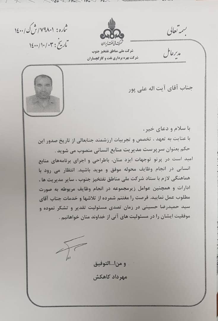 به گزارش اختصاصی خبرآوران، مهندس مهرداد کاهکش ، مدیرعامل شرکت بهرهبرداری نفت و گاز گچساران طی حکمی آیتالله علیپور برادر شهید معظم فتحالله علیپور را بعنوان سرپرست مدیریت منابع انسانی شرکت بهرهبرداری نفت و گاز گچساران منصوب نمود.