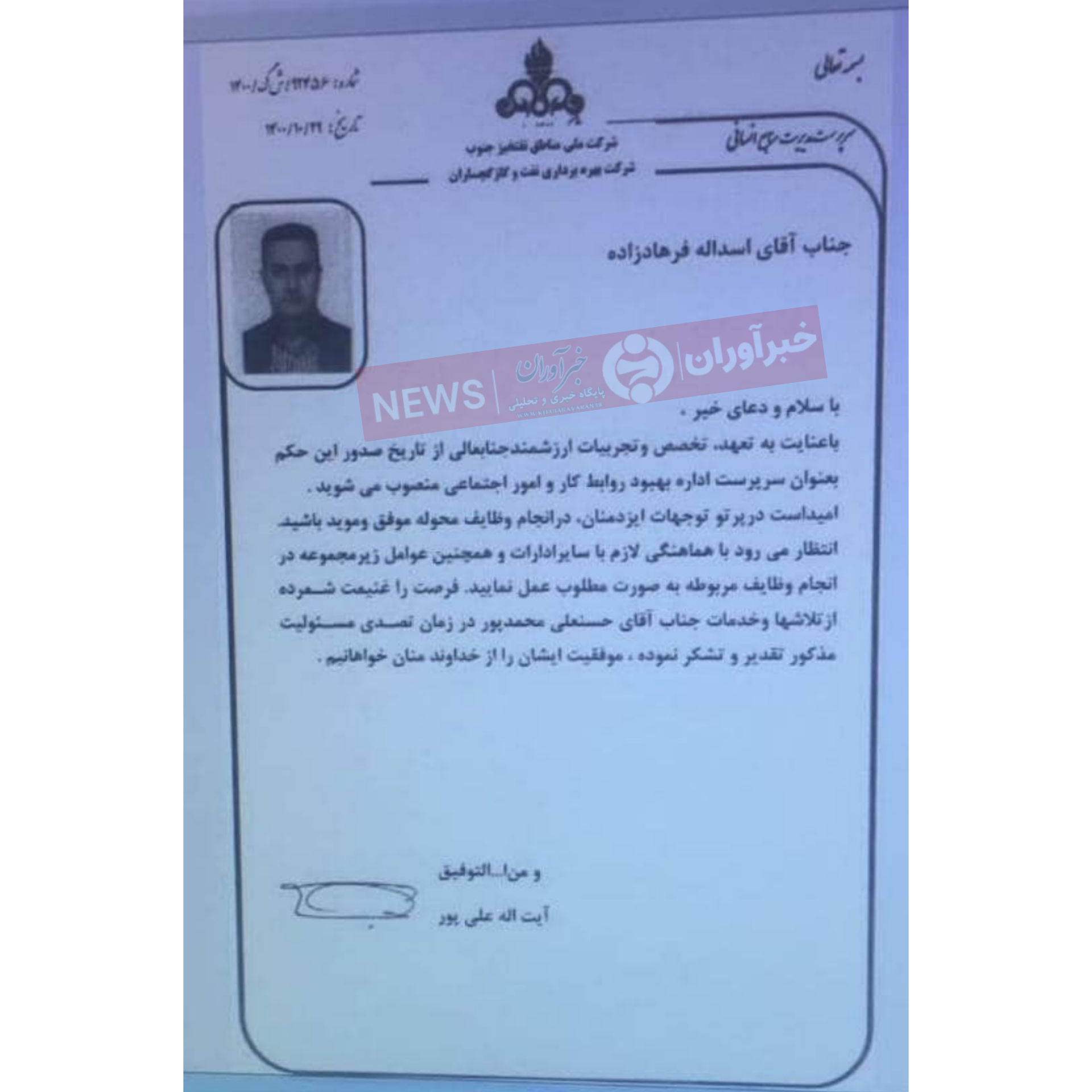 به گزارش اختصاصی خبرآوران ، آیتاله علیپور ، سرپرست مدیریت منابع انسانی شرکت بهرهبرداری نفت و گاز گچساران طی حکمی اسداله فرهادزاده را بعنوان سرپرست اداره بهبود روابط کار و امور اجتماعی این شرکت منصوب نمود.