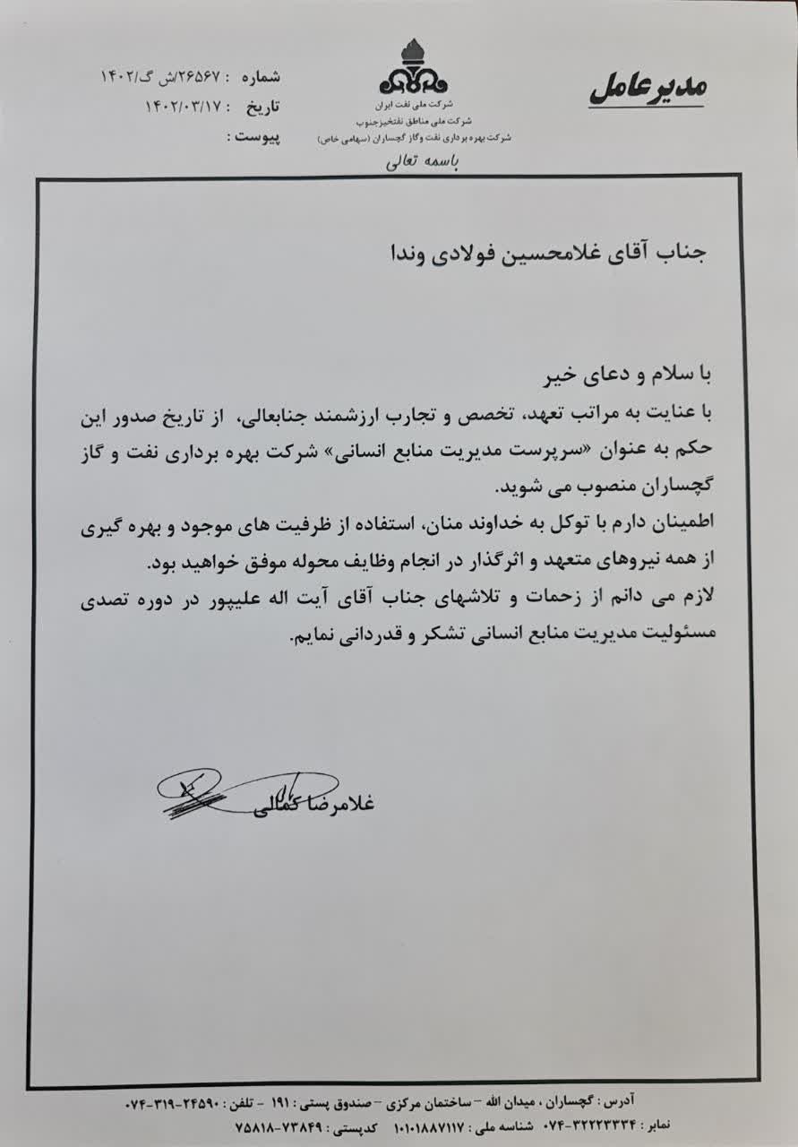سرپرست جدید مدیریت منابع انسانی نفت گچساران منصوب شد+ حکم